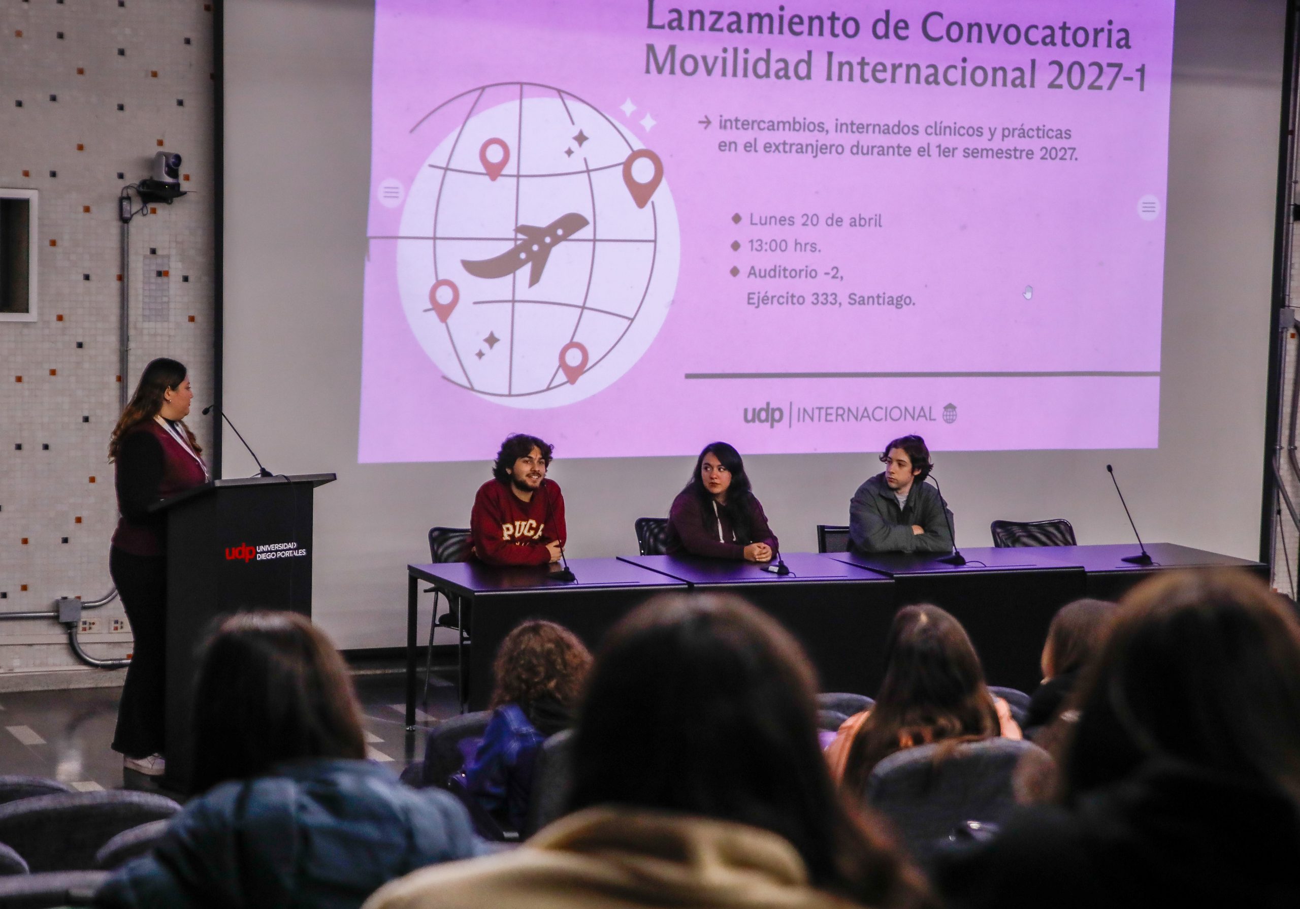 Durante la actividad, las y los asistentes realizaron distintas consultas sobre el proceso. Además, un grupo de estudiantes expuso sobre su experiencia de internacionalización, entre ellos, Constanza Olivares, estudiante de Kinesiología, quien cursó un intercambio en la Universidad del Estado de Santa Catarina (Brasil); Benjamín Garín, estudiante de Sociología, quien viajó a la Pontificia Universidad Católica del Perú; y Benjamín Morales, estudiante de Ingeniería Civil en Informática y Telecomunicaciones, cuyo proceso de internacionalización fue realizado en Hochschule München (Alemania).