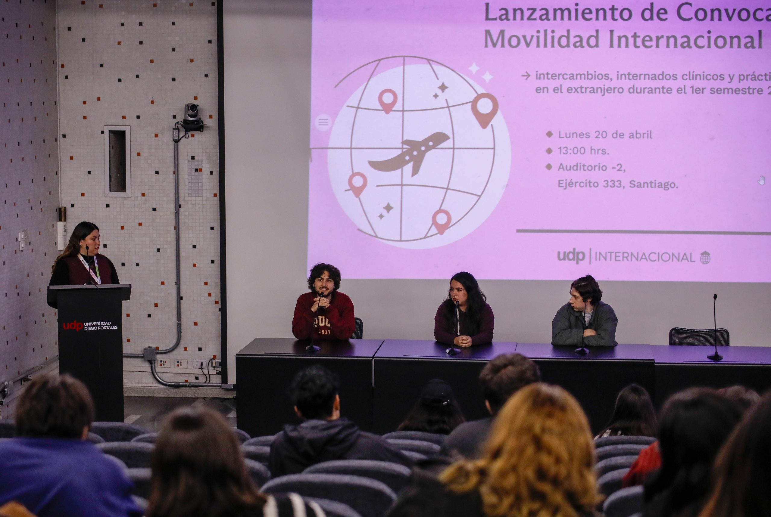 La convocatoria fue presentada en el marco de una charla abierta a la comunidad estudiantil, actividad que fue desarrollada para dar a conocer los pasos del proceso, los requisitos de postulación, los destinos disponibles y las distintas formas de financiamiento existentes para las y los estudiantes.